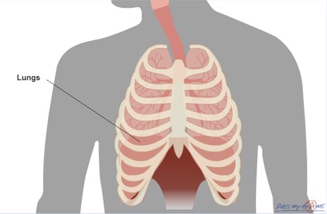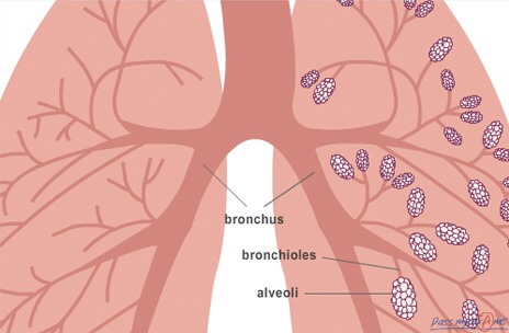 In order to see how gas exchange occurs we need to look further into the lungs. Firstly we know that air enters the body through the mouth or nose, from here it moves to the pharynx (throat), passes through the larynx (voice box) and enters the trachea. The trachea splits into two branches, *the left and right bronchus*, each bronchus divides many times into smaller branches called *bronchioles*. Each bronchiole finally leads to a bunch of tiny air sacs, called *alveoli*, which inflate during inhalation, and deflate during exhalation.