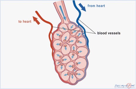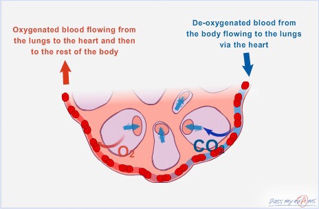 The walls of the alveoli are surrounded by a network of blood capillaries. In fact the alveoli walls share a membrane with the capillaries which allows for oxygen to diffuse through the alveoli wall and enter the bloodstream and then travel to the heart. At the same time it allows for carbon dioxide to diffuse from the bloodstream into the alveoli and exhaled out of the body. Both oxygen and carbon dioxide move from areas of high concentration to areas of lower concentration.
